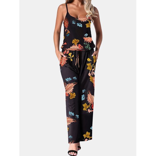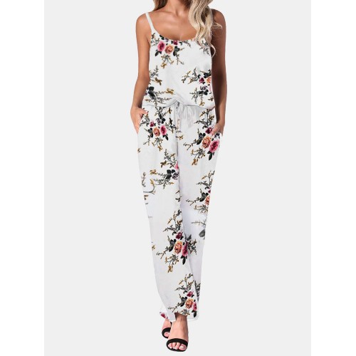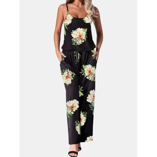 Flower Print Drawstring Pocket Strap Jumpsuit For Women