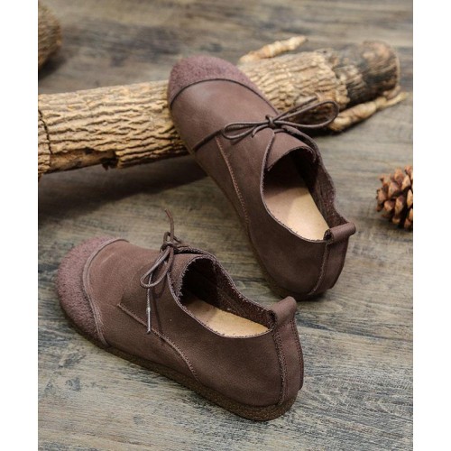 Khaki Genuine Leather Flat Shoes For Women Lace Up Splicing Flat Shoes