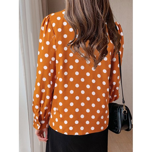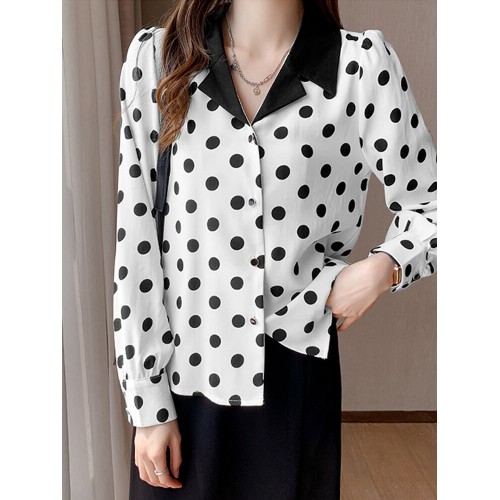 Polka Dot Contrast Color Lapel Button Long Sleeve Casual Shirt