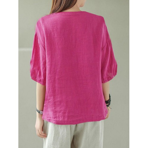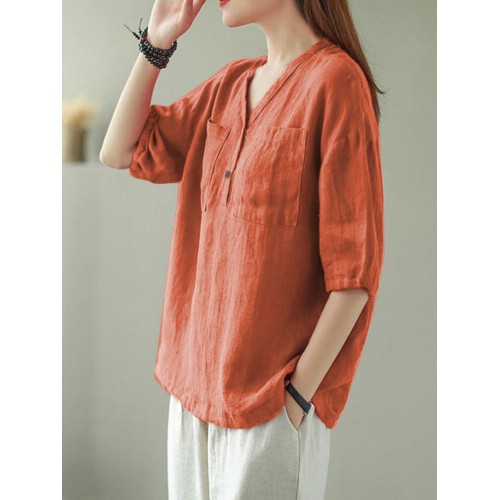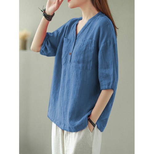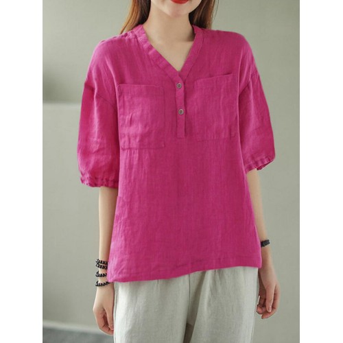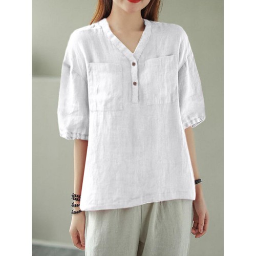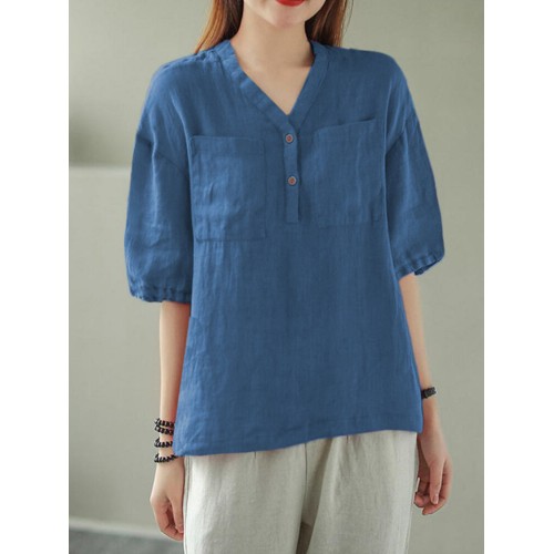 Solid Button Pocket V Neck Half Sleeve Casual Cotton Blouse