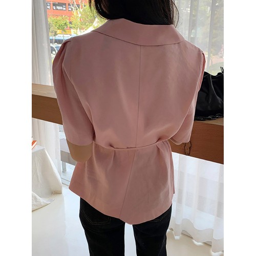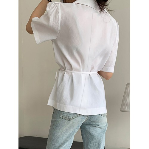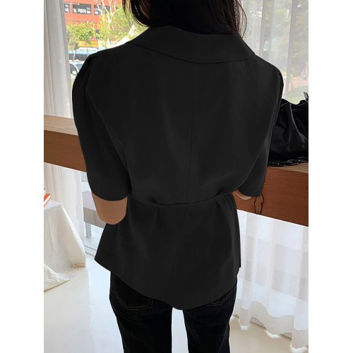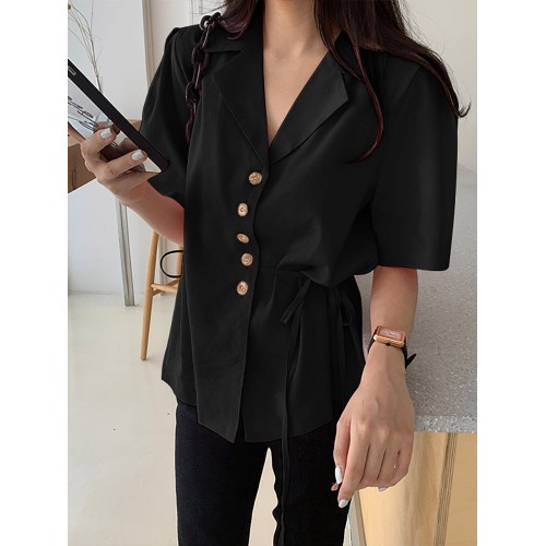 Solid Button Tie Up Lapel Short Sleeve Casual Cotton Blouse