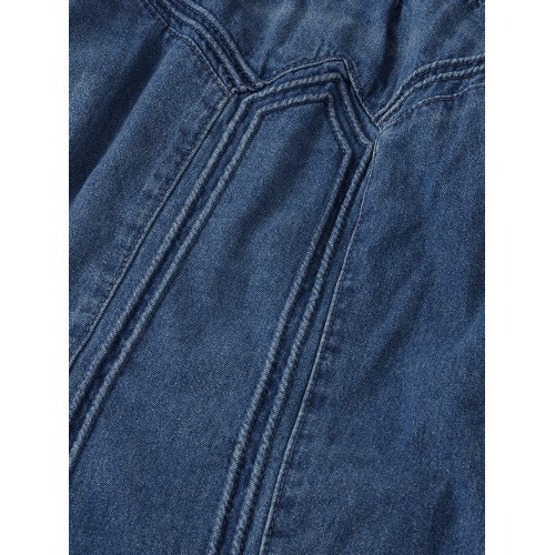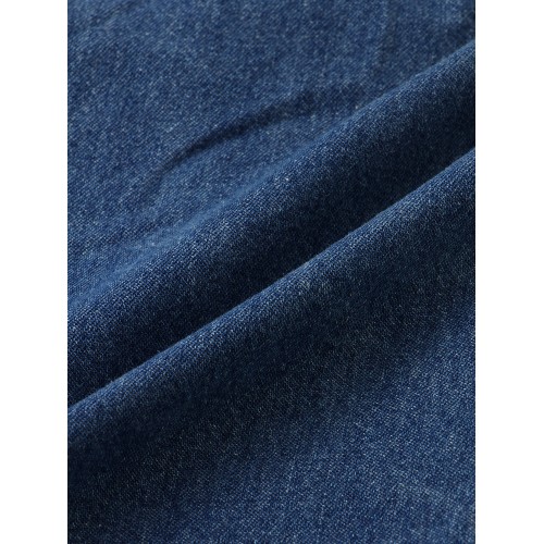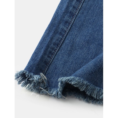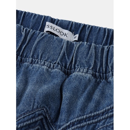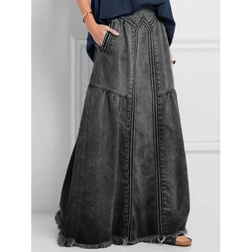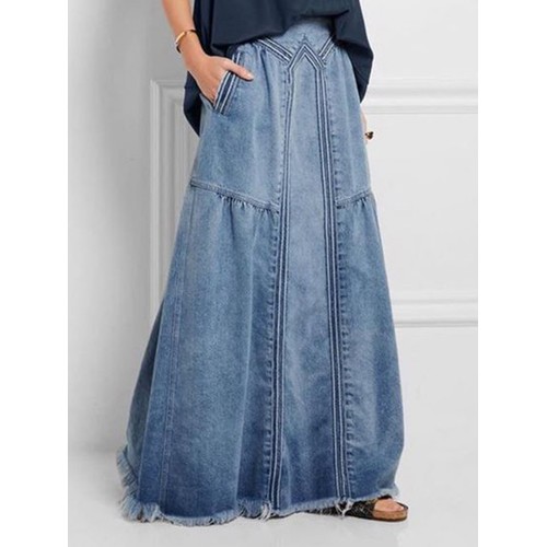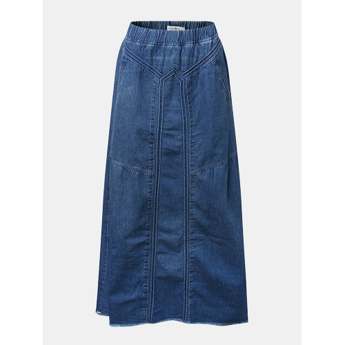 Women Distressed Solid Color Elastic Waist Loose Denim Skirt With Pocket