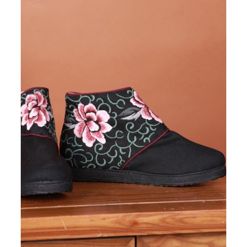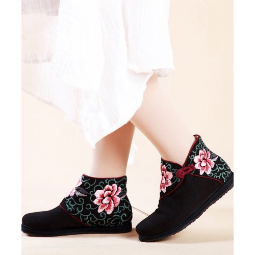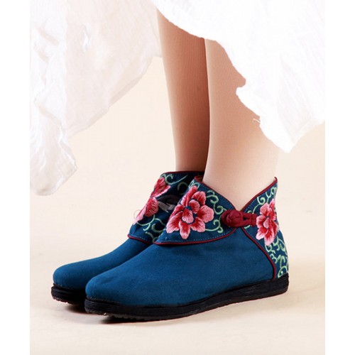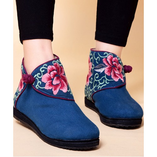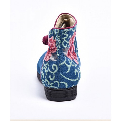 Boutique Buckle Strap Embroideried Comfy Ankle Boots Blue Cotton Fabric