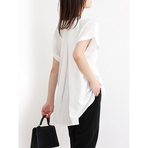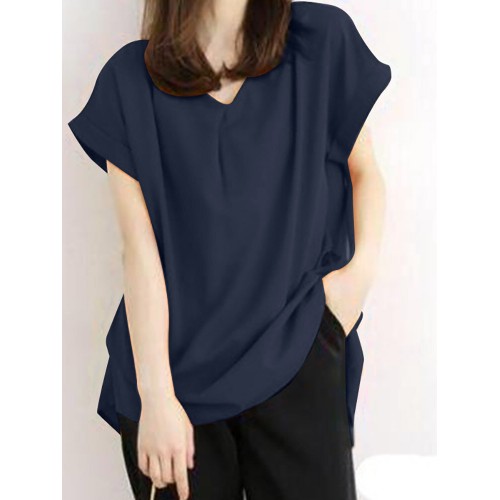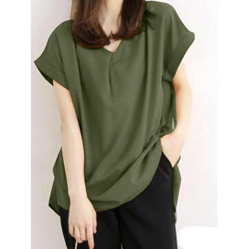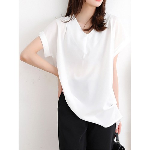 Solid Ruched Short Sleeve V Neck Casual Blouse